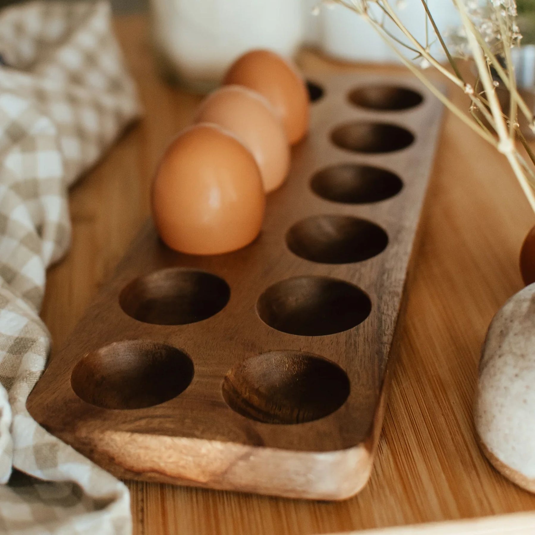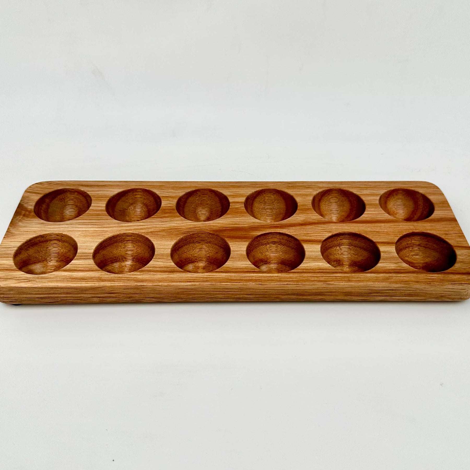 This wooden countertop egg holder is made of sustainably sourced acacia wood. Perfect for farm fresh eggs that stay on your countertop.