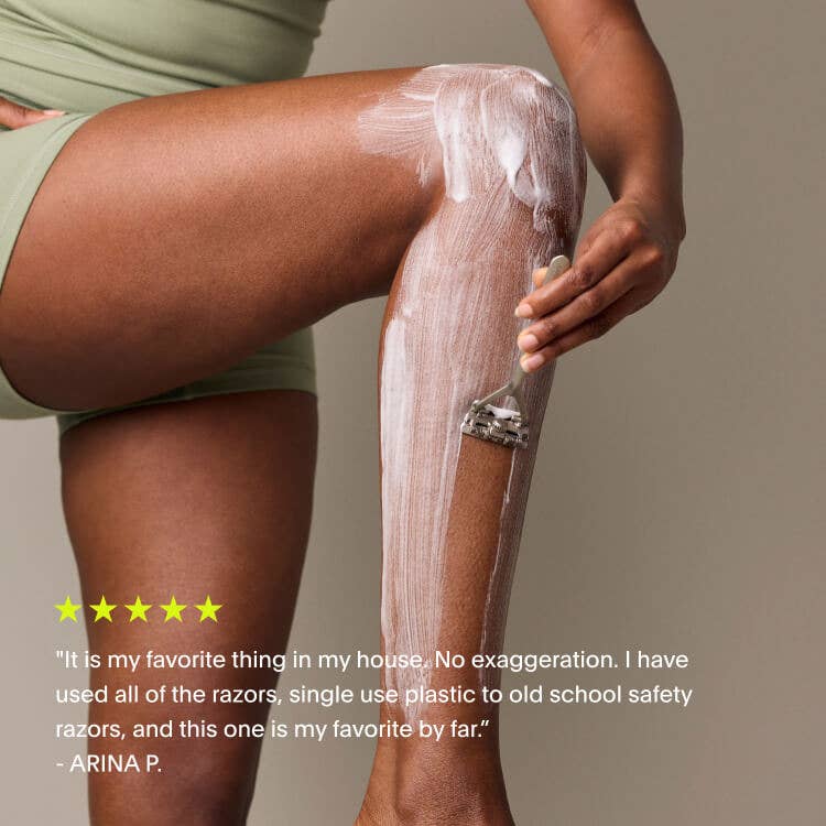The Leaf Razor Kit comes with everything you need for a great shave. There’s no razor quite like The Leaf. Its unique pivoting head holds up to three blades and effortlessly follows every curve and contour—giving you a close, smooth shave that feels just like the popular 5-blade cartridges. The difference? No plastic waste. And refill blades cost just pennies. For more control slide on a silicone grip sleeve.