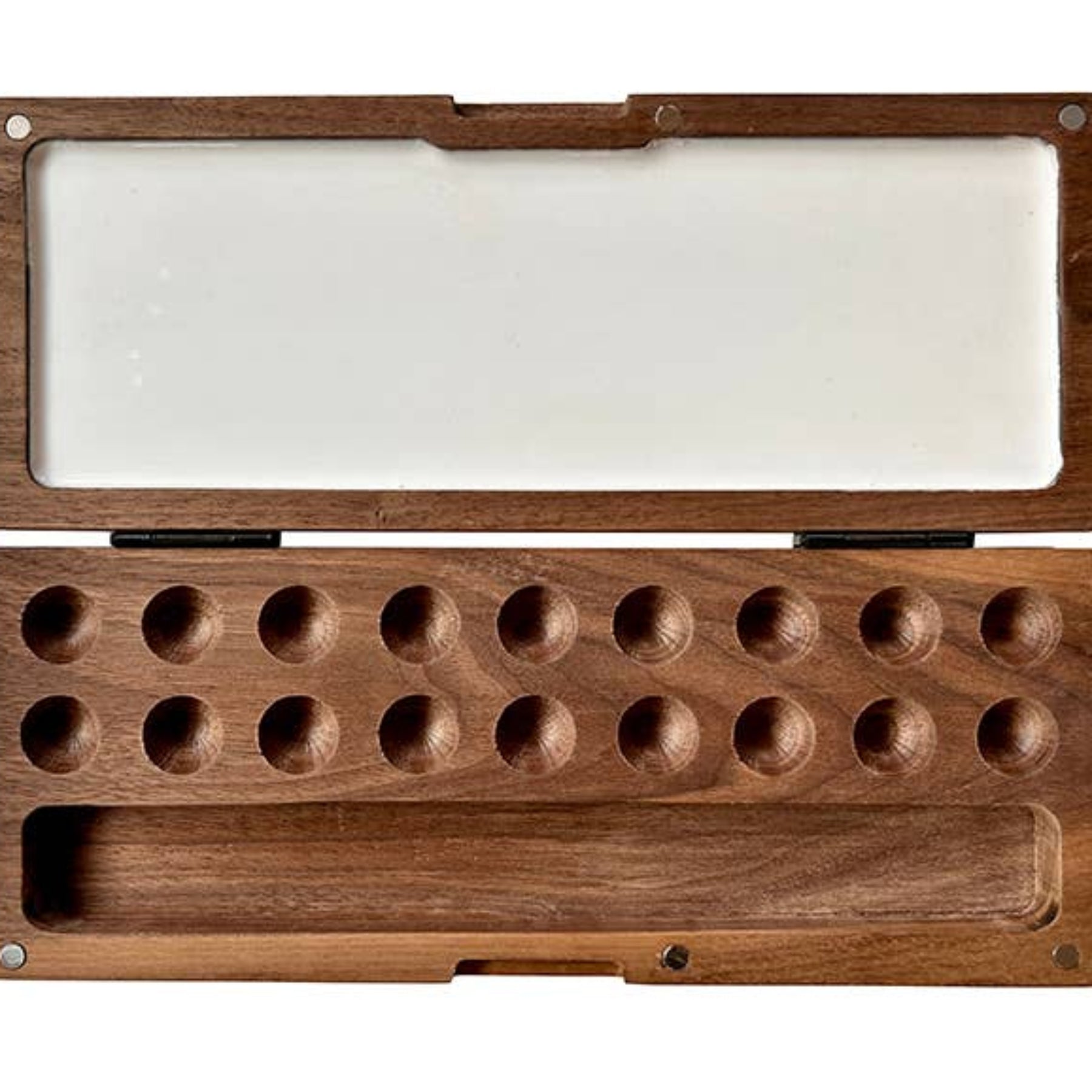A beautiful, eco-friendly, hand-crafted, walnut watercolor palette with a brush holder.